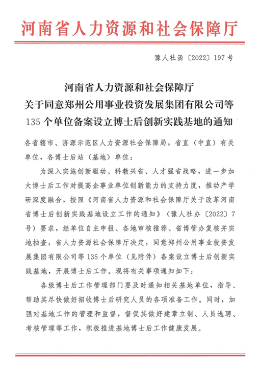 7月7日,河南省人力資源和社會保障廳下發(fā)《關(guān)于同意鄭州公用事業(yè)投資發(fā)展集團(tuán)有限公司等135個(gè)單位備案設(shè)立博士后創(chuàng)新實(shí)踐基地的通知》(豫人社函〔2022〕197號),我公司成功獲批設(shè)立博士后創(chuàng)新實(shí)踐基地。