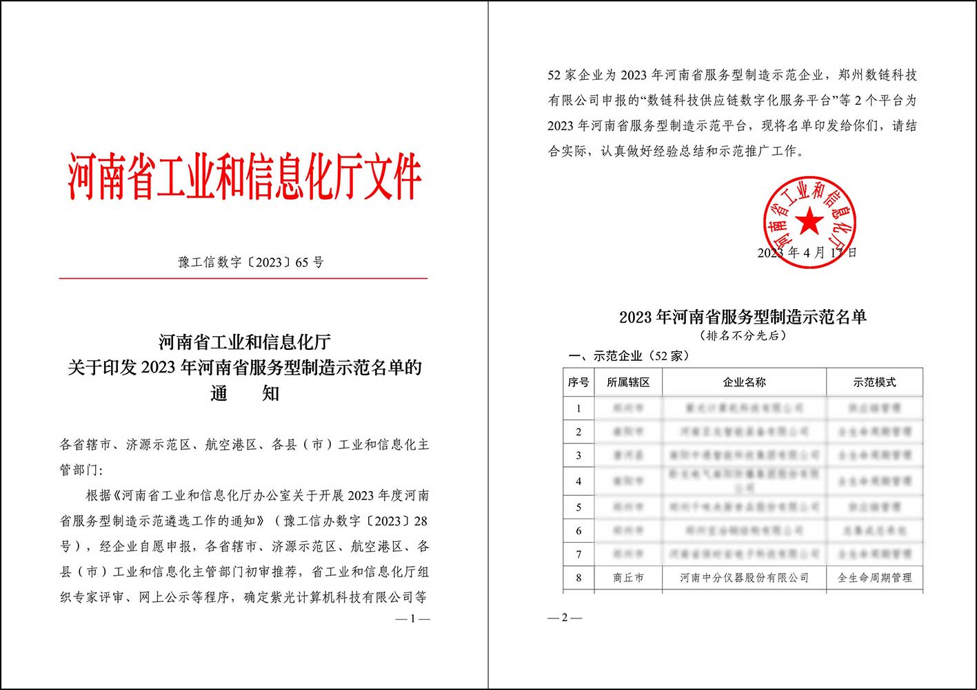 近日,河南省工業(yè)與信息化廳公布了《河南省工業(yè)與信息化廳關(guān)于印發(fā)2023年河南省服務(wù)型制造示范名單的通知》,我公司被評為河南省服務(wù)型制造示范企業(yè),這是對我公司服務(wù)理念和綜合實(shí)力的認(rèn)可。