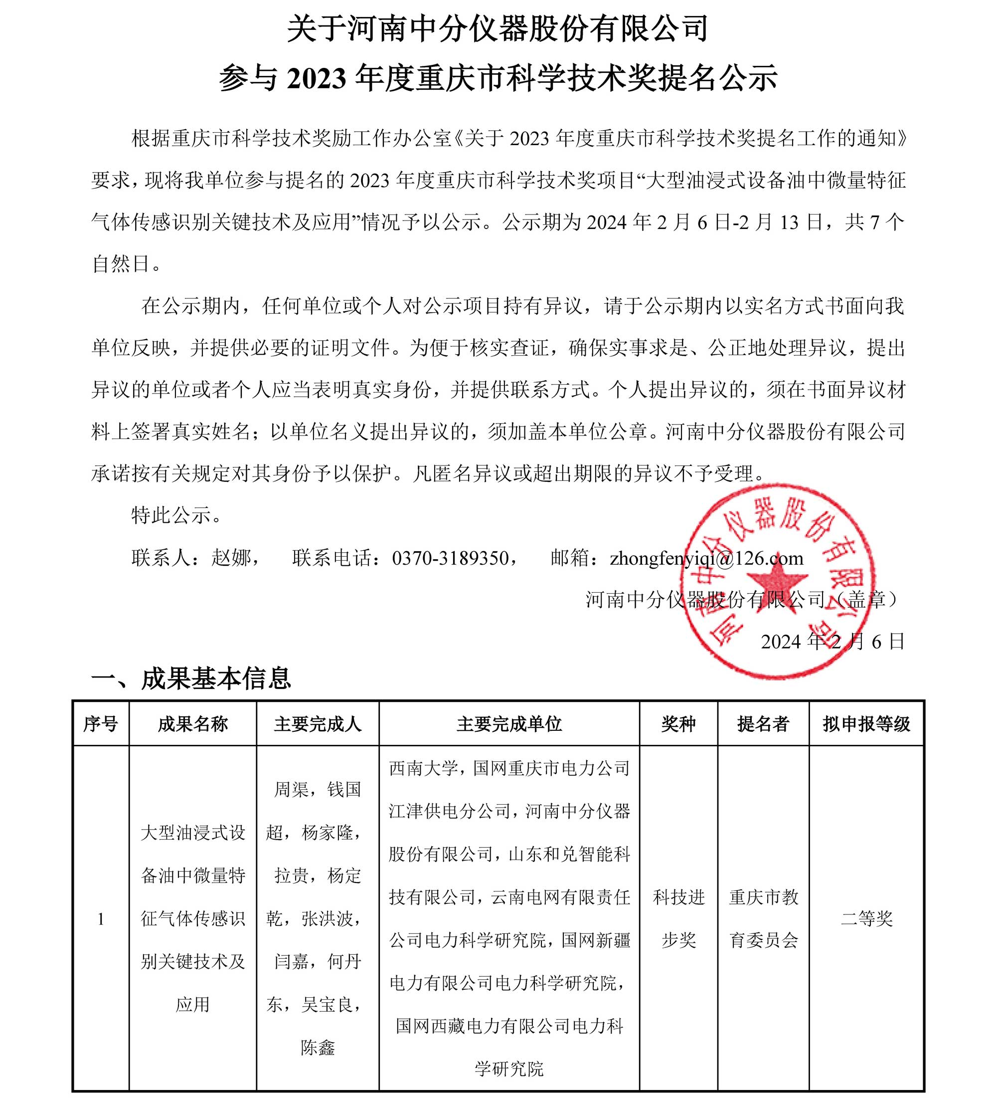 關于河南中分儀器股份有限公司參與2023年度重慶市科學技術(shù)獎提名公示